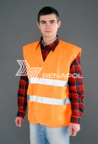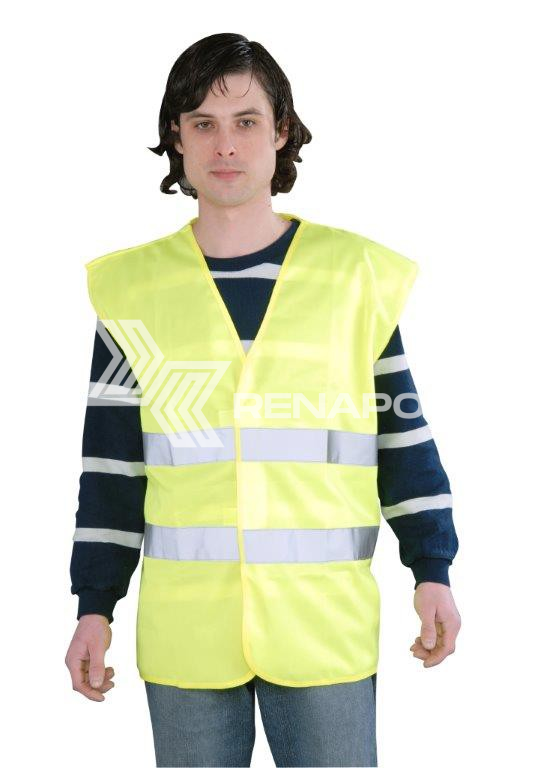 Kamizelka z 2 poziomymi pasami odblaskowymi. Zgodna z norma EN iSO-20471. Zapięcie na rzep.