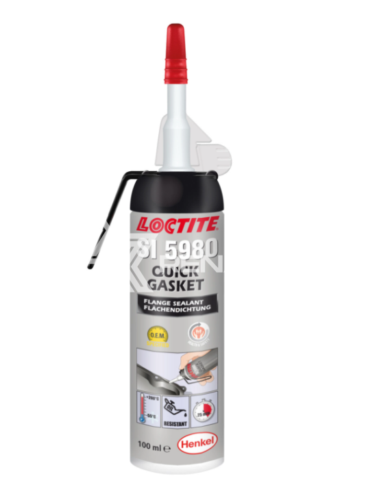 LOCTITE SI 5980 to klej uszczelniający do złączy kołnierzowych, posiadający doskonałą adhezję. Idealny do dużych szczelin. Nie zawiera substancji niebezpiecznych. Doskonała odporność na olej. Typowe aplikacje obejmują silniki, skrzynie biegów, miski olejowe, pokrywy łańcucha napędu rozrządu, obudowy pomp i przekładni, obudowy termostatu, wymienniki ciepła, gdzie potrzebna jest wysoka odporność na ruchy złączy.