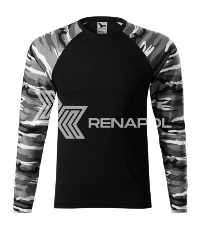 krój ze szwami bocznymi, wąska lamówka z dzianiny ściągaczowej 1:1 z dodatkiem 5 % elastanu, lamówka na karku wzmocniona taśmą w kolorze 01, długie raglanowe rękawy w kolorze camouflage, produkt nie będzie już dostępny
