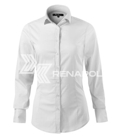 Dopasowany krój z bocznymi szwami, podwójny karczek, zaszewki podkreślające damska figurę, kołnierzyk koszulowy, części przednie wykończone plisą, długie rękawy ze ściętymi mankietami i 2 guzikami, perłowe guziki w kolorze materiału (1 zapasowy), zaokrąglony dół.Skład materiału: 68 % bawełnaSkład materiału: 29 % polyamidSkład materiału: 3 % elastanGramatura: 110 g/m²Prać w: 30 °CMetka: tkanaMetoda znakowania odzieży: haft, sitodruk, transfer cyfrowy, lithotransfer, sitodruk transferowy, wymiana metki