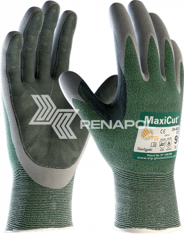 Rękawice ATG-MaxiCut®-Oil™-34-450LP przeznaczone do pracy w środowisku zaolejonym z ryzykiem przecięcia oraz narażeniem na kontakt z gorącymi przedmiotami - ochrona przed ciepłem kontaktowym do 100°C przez 15 sekund. Wykonane z przędzy UHMWPE, włókna szklanego, nylonu, poliestru i tkaniny typu Spandex. Część chwytna powleczona spienionym nitrylem (NBR) oraz skórzaną wstawką. Nie nadają się do kontaktu z otwartym ogniem.