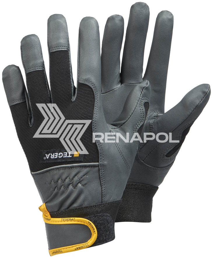 Rękawica TEGERA® 9105 ze skóry syntetycznej ma zapięcie na rzepy, które zapewnia bezpieczniejsze dopasowanie. Materiał w części chwytnej to Microthan®, który zapewnia dodatkową trwałość, a materiał na grzbiecie to nylon. Nadaje się do montażu precyzyjnego w suchych i lekko zaolejonych środowiskach, w których niezbędna jest dobra przyczepność i zręczność.