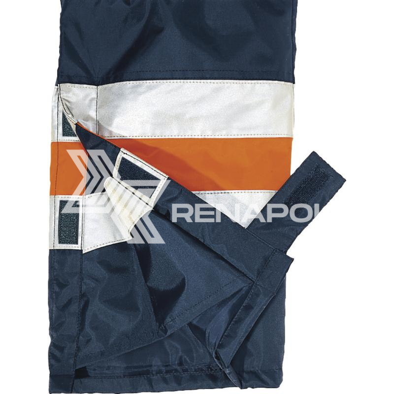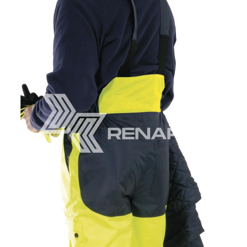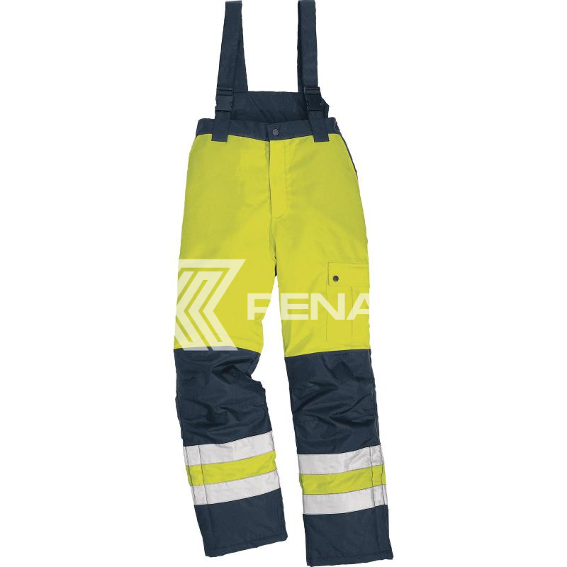 Spodnie ocieplane. Szwy uszczelnione. Gumka w talii po bokach. Elastyczne szelki z możliwością regulacji. Kolana wstępnie uformowane. Odzież ostrzegawcza: klasa 1 - kolor srebrny. 4 kieszenie. Tkanina: poliester Oxford powlekany poliuretanem.Podszewka: watowana, poliester tafta.Pasy odblaskowe naszywane.